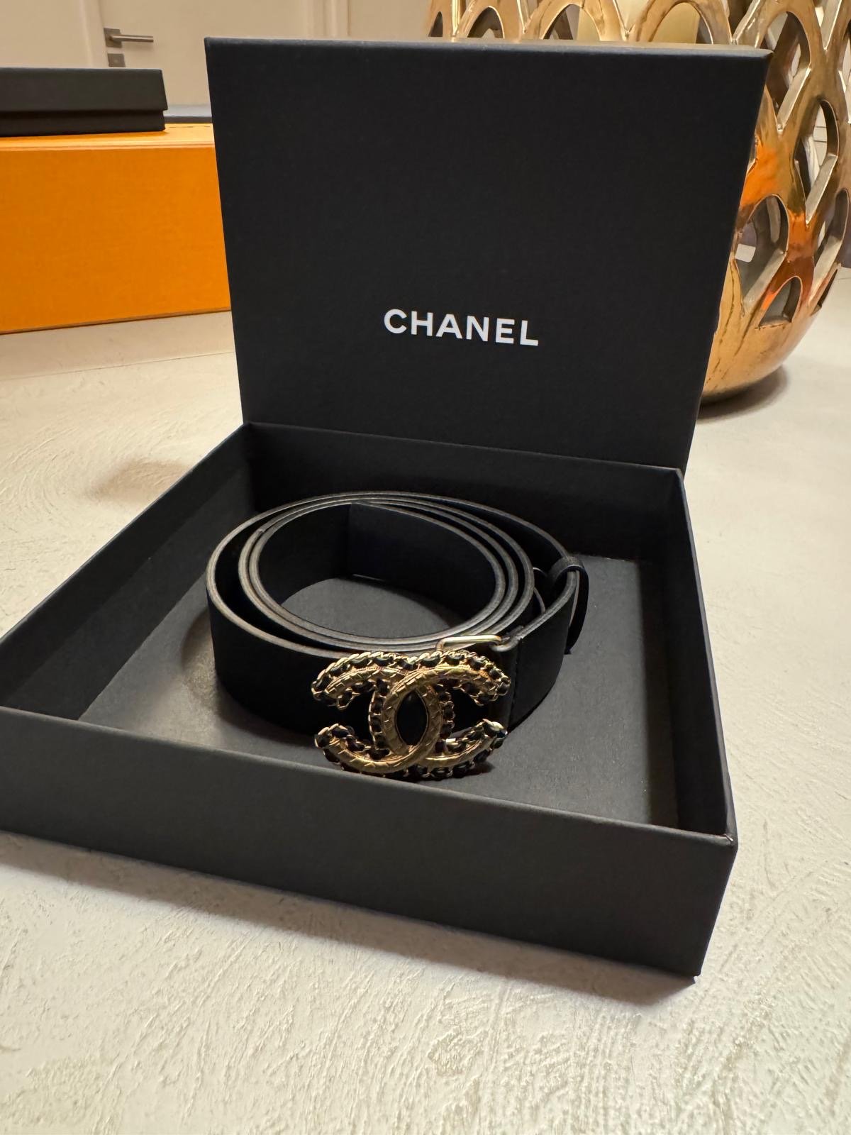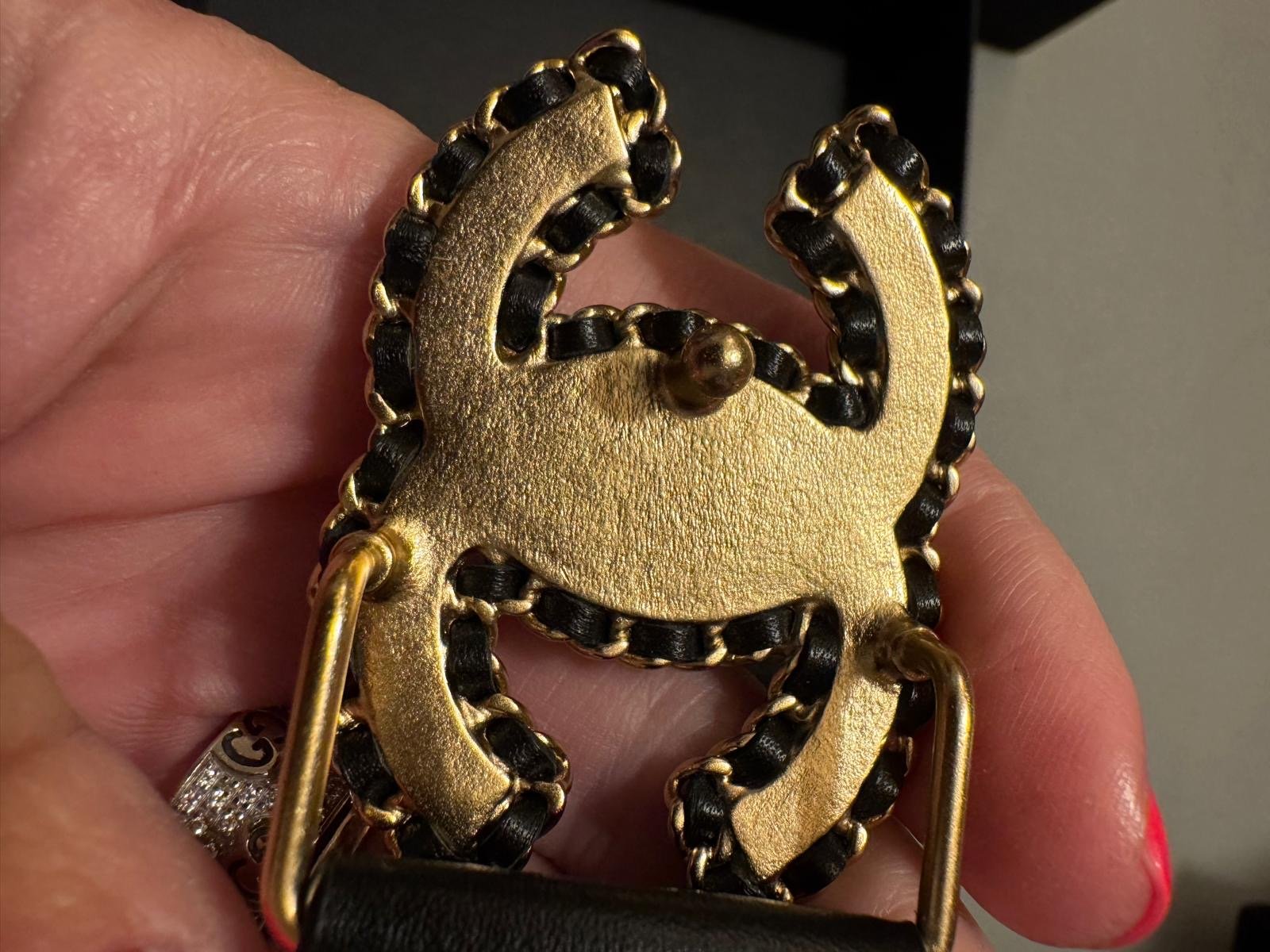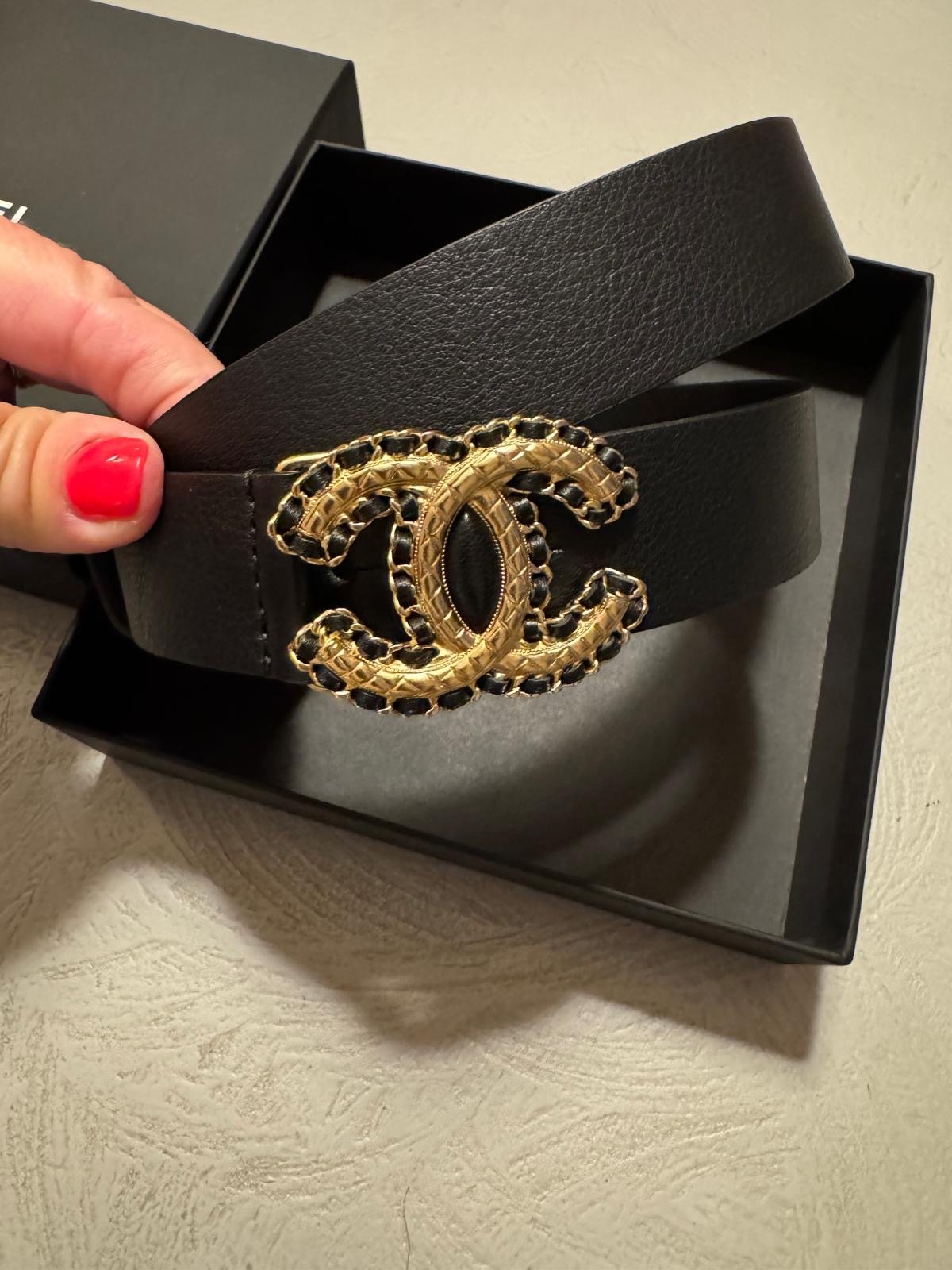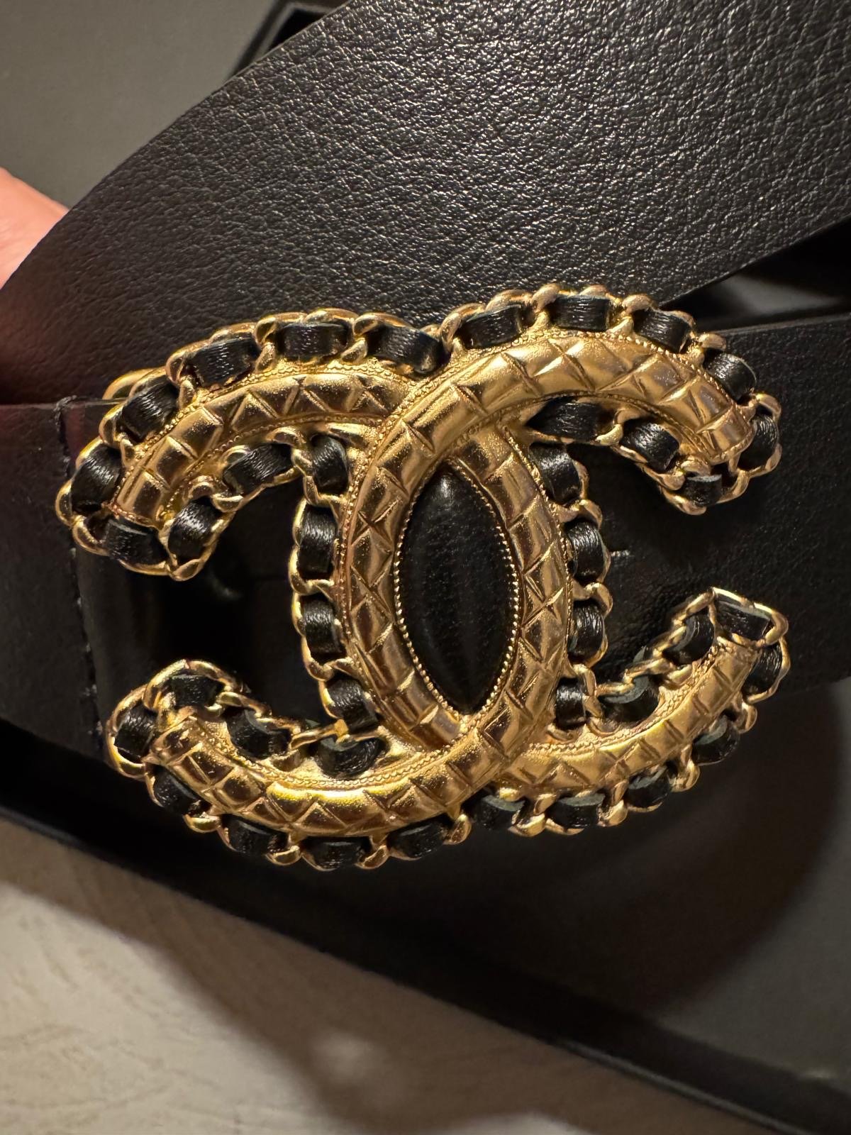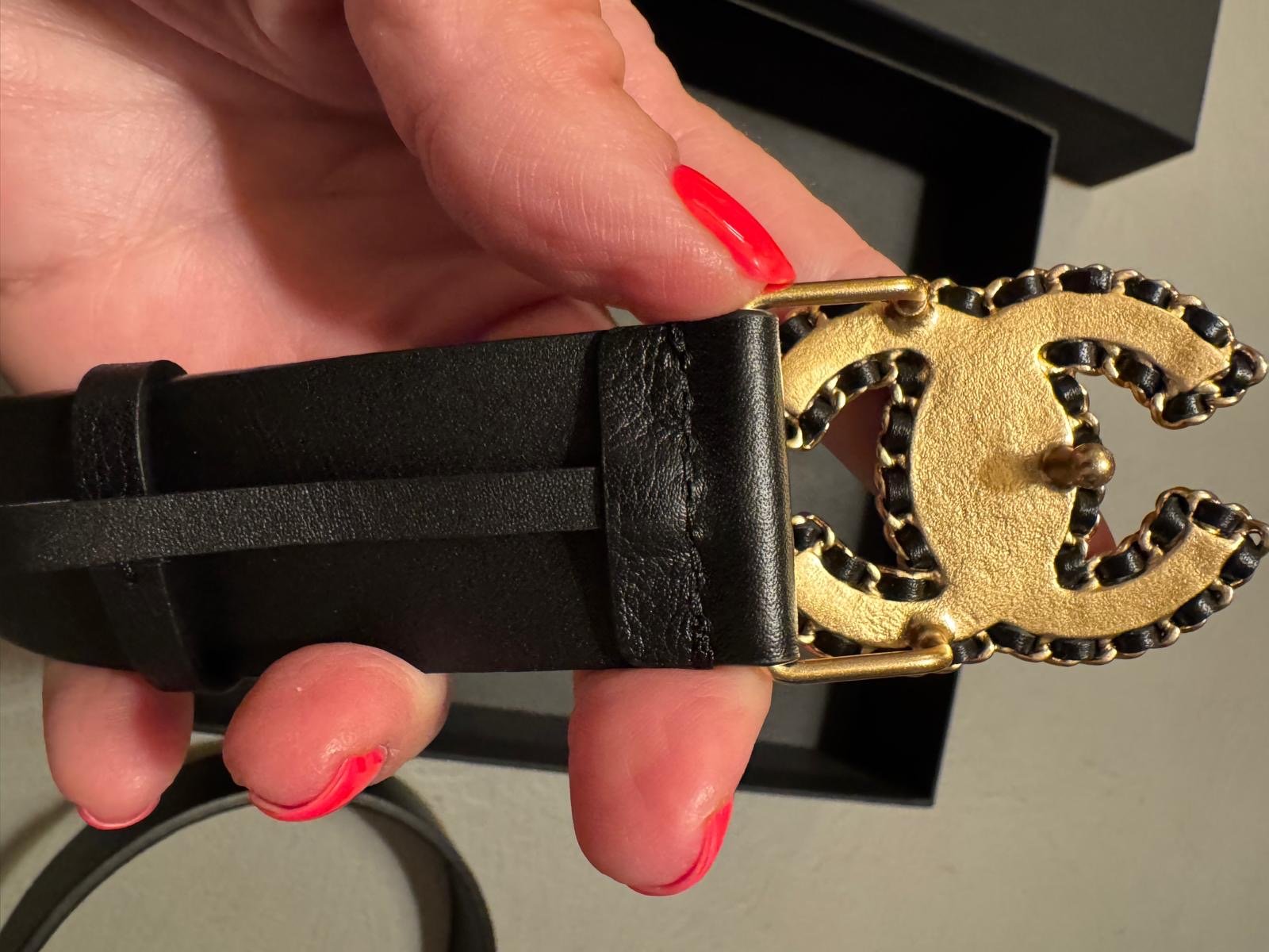 Élégante ceinture Chanel, modèle intemporel de la maison, parfaite pour sublimer une tenue avec une touche de luxe.